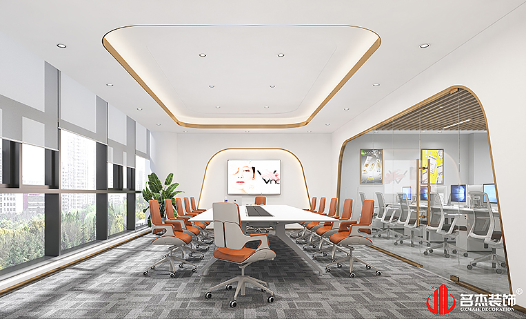 在整个的办公室装修设计当中,主要的空间采用土豪金和活力橙作为空间的点缀色,让空间的设计感层层递进。同时时尚流行的风格是非常符合化妆品这个行业的,能够重点突出产品的特点以及特色,使得产品变得更加吸引人。