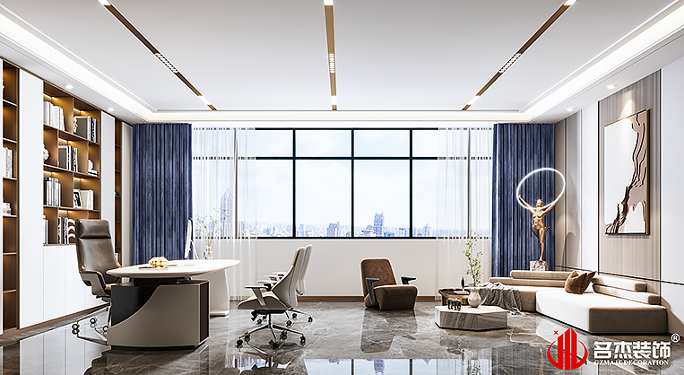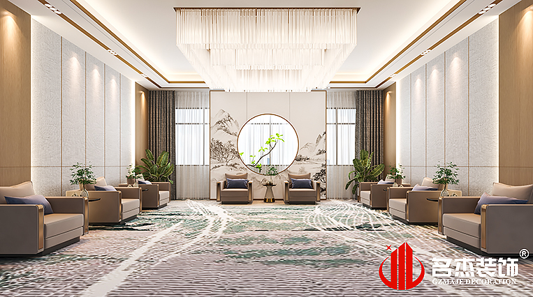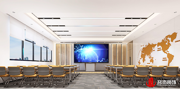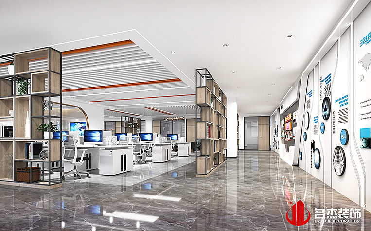 时尚轻奢的风格加入企业的logo色系,两者相互结合起来碰撞出不一样的火花,让整个办公装修设计空间变得更加有层次感和设计感。在整个空间中加入土豪金作为点缀色彩,让轻奢的元素由内而外的展示出来,突出行业特色的同时,还增加了不少的设计层次感。