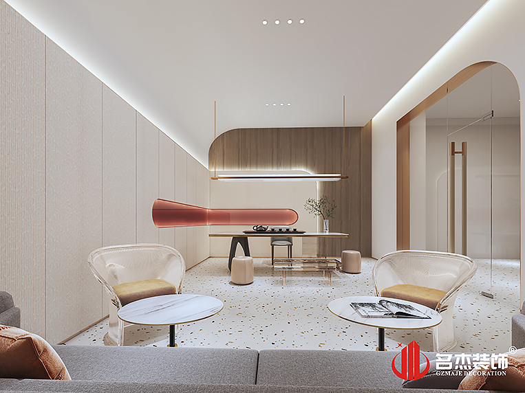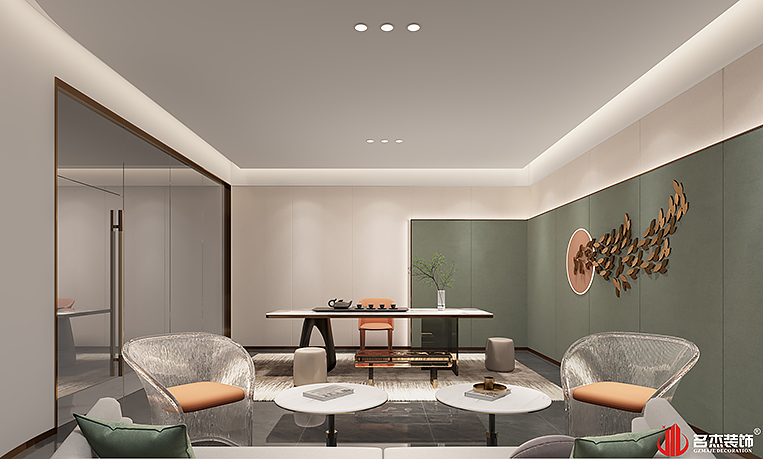 在前台区域使用圆顶造型的天花来作为整个办公室装修设计空间的点睛之笔,同时配波浪板的背景墙,让人有一种仿佛置身大海一般。在接待室里面选择性地使用圆弧线条,加以莫兰迪色系以及护墙板的,灯带的恰到好处地使用,让接待室的休闲感和柔和感更加浓郁。而在另一个接待室则是采用不一样的设计处理手法,以直的元素作为主打元素,同时也搭配莫兰迪色系作为点缀色系,也更突出空间的休闲感。