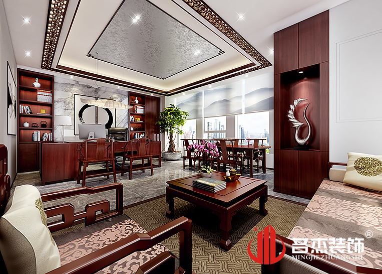 在本案例中自然光源很是重要,因此本办公室设计案例设计师充分利用了来自窗外的自然光线,为本来独树一帜的办公室赋予灵动的生命力,由于客户的主要客户为企业客户和社会中上阶层,故整体设计以现代简约和现代中式为主,美丽大方,空间感艺术感俱佳。设计布局规整,中轴对称设计体现出大公司独有的作风与魄力,空间设计打破传统办公设计,以玫瑰金,大理石为主,通过各种创新的方法运用不但拉近了人与人之间的距离,也更享受多功能化、智能、人性、以及趣味一体的模式。