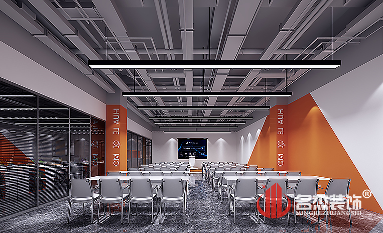 在办公设计装修区域里面加入了代表活力的橙色作为点缀色,让整个办公区域增添了不少时尚活力的气氛,也和企业Logo的颜色相互呼应,将企业文化加入到整体的办公环境当中。主要采用的是白色为主基调色,好处就在于能让整个空间显得更加大气。