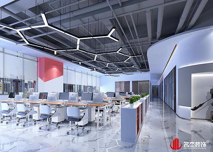 前台区域加入了很多的弧形元素,为整体的设计感大大提升了好几个档次,同时也在部分的柱子上加入企业LOGO色来作为点缀。展厅天花部分则采用蜂巢状的灯具,表达出一种像蜂群一样的勤劳工作的寓意。