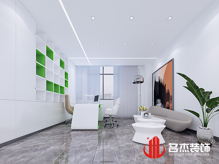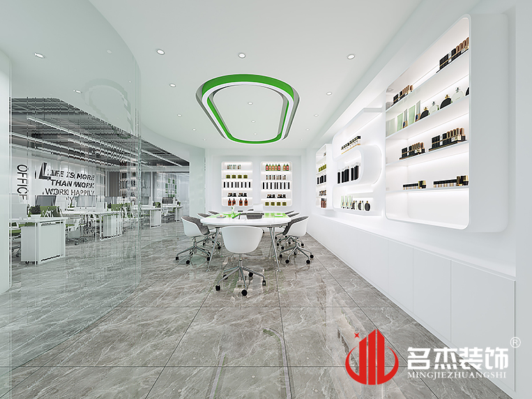 整体设计以白色作为主设计基调,加以绿色作为点缀色,让空间的绿色环保感觉一下子就出来了。而且加入圆弧形元素能够让空间更加有设计层次感。在展厅区域使用玻璃隔墙来增加整体空间的通透感,同时能够增强视觉上的观感。