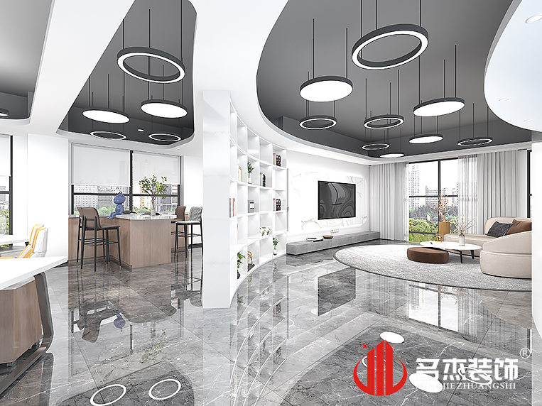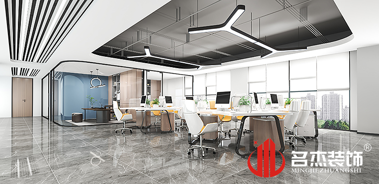 通过开放式的布局来提升空间的层次感,利用装饰的点缀色来凸显空间设计的层次感。同时使用简易的吊顶造型,配以有设计感的灯饰,空间的设计感就油然而生。使用通透的玻璃隔墙来增加办公室装修设计区域的设计感,同时也能让整体的视觉更加广阔。
