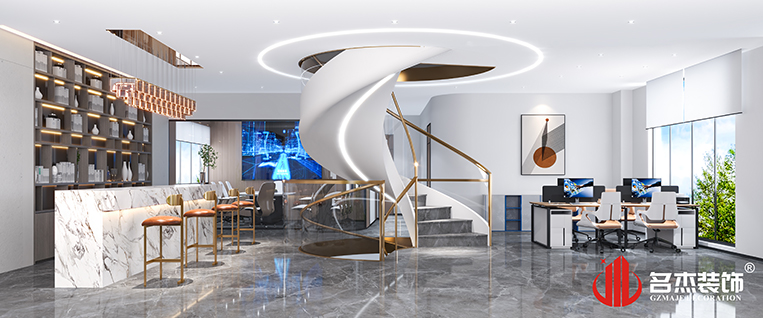 考虑到企业是以销售为主,简约的风格是可以让办公室装修设计空间看起来更加干练,同时没有过多的装饰,让空间变得更加有效率。在展厅区域采用科技感强烈的元素,让空间充满未来感。而在休闲区则是使用简约而不简单的元素,加上灯带的烘托下,舒适休闲的感觉油然而生,可以让员工紧张的情绪得到放松。