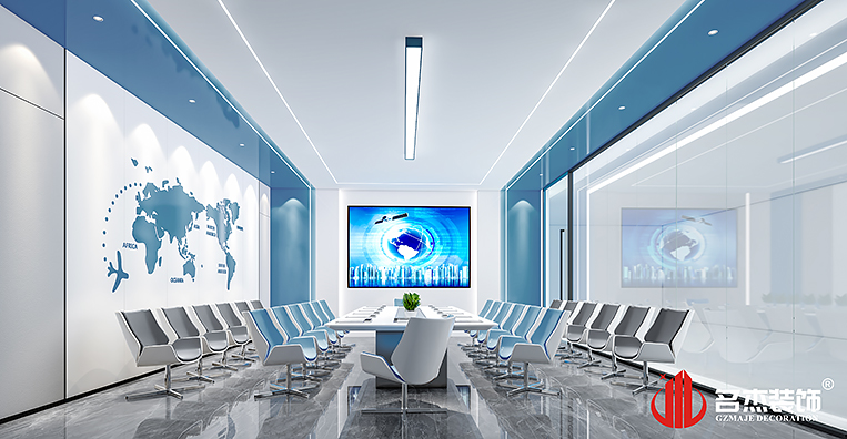 办公室装修设计空间在设计上面是采用的是科技风格为主的元素,加入科技蓝的设计元素,作为空间的点缀元素,同时也能够增加整体的科技感。对于造型的应用也是能够很容易看出来设计团队的用心程度,利用不同的造型来搭配出不一样的设计层次感。