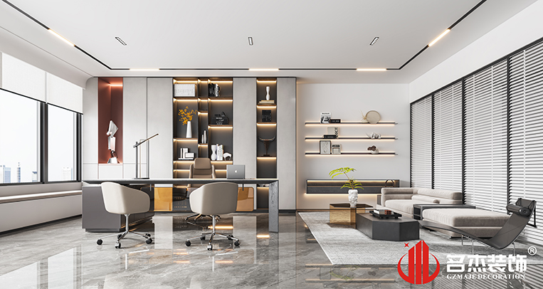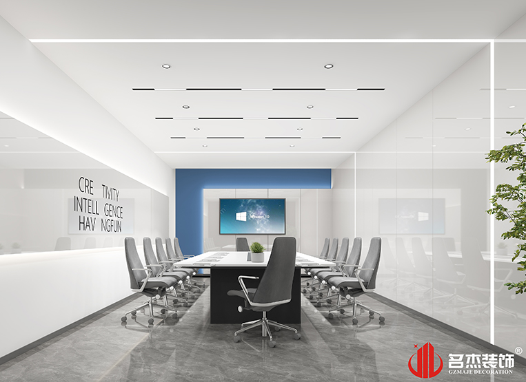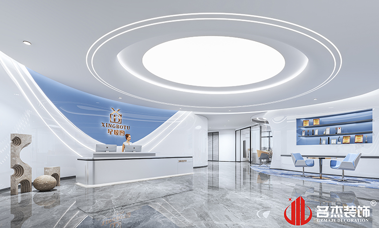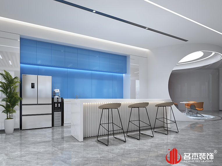 整体使用时尚简约的风格,让办公空间看起来更加简洁,同时在不同区域使用蓝色作为点缀色,给空间增添了几分科技感的同时,也让空间变得不那么单调。前台区域使用圆弧造型的吊顶,搭配弧线形的背景墙,形成一种呼应的同时,还能够增加前台空间的层次感。在办公区域使用蓝色喷漆,区别于传统的黑白灰,让空间更加具有辨识度。