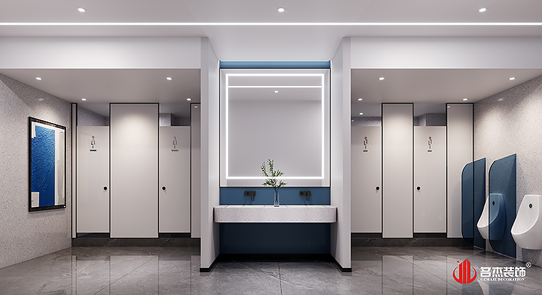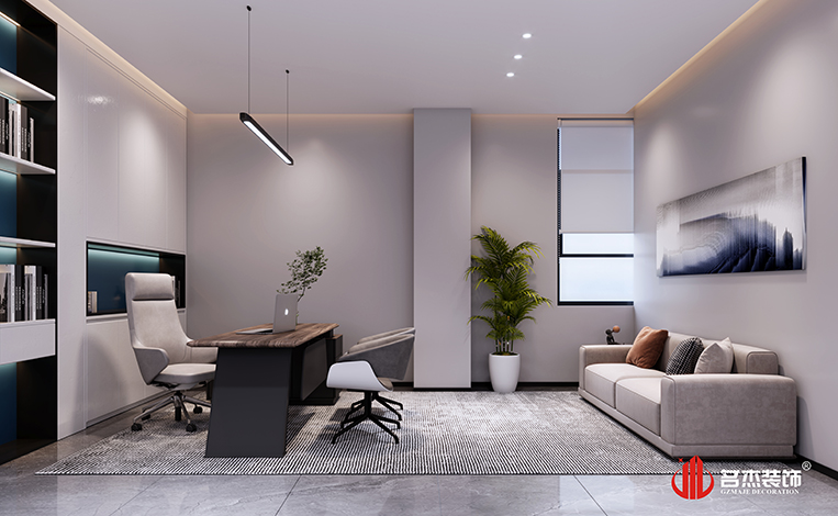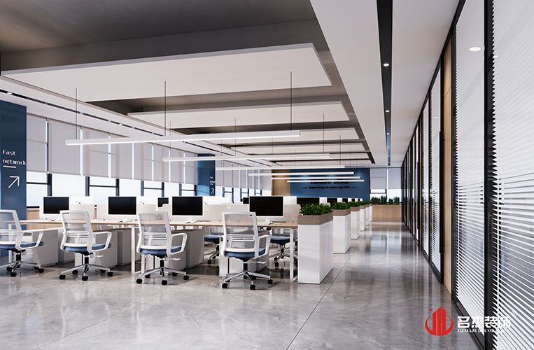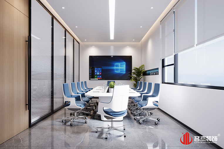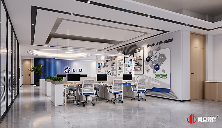 整个办公装修设计空间是以时尚简约的风格来作为主打风格的,加入企业LOGO色——蓝色,作为贯穿整个办公装修设计空间的点缀色。前厅的背景墙使用的是一种渐变的手法,让办公装修设计空间变得更有设计感,同时在前厅的吊顶使用圆弧的元素,让办公装修设计空间变得更加有层次感。