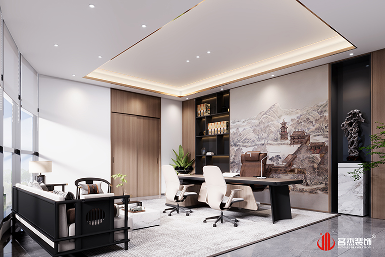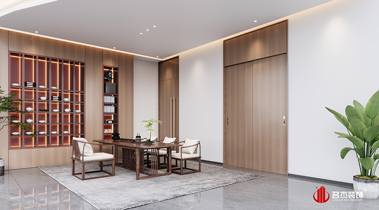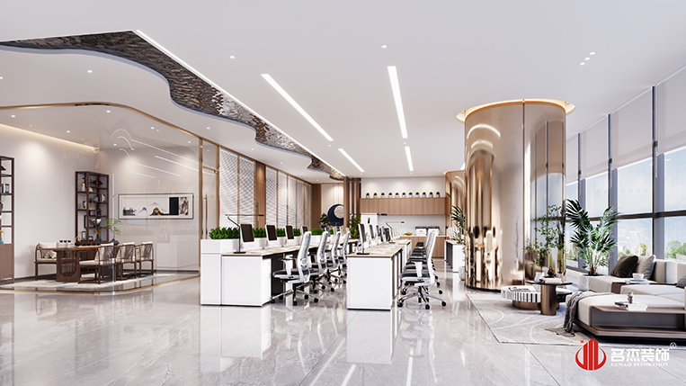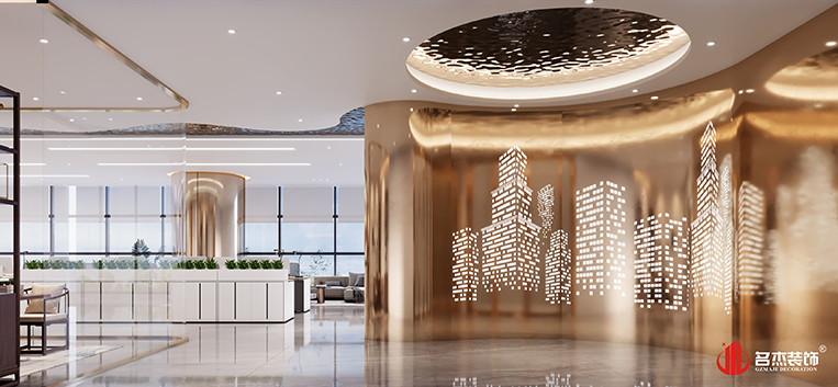 整个办公空间使用土豪金的配色作为主调色,加入土豪金配色能够让办公室装修设计空间变得更有奢华的感觉,更能够体现出新能源这个行业的发展是非常有前景的。前台区域使用铝材冲孔板作为背景墙,加入土豪金的颜色,一下子就能够让人感受到这个空间奢华感。在茶室区域使用弧形玻璃,搭配有造型的天花,设计感一下子就出来了。