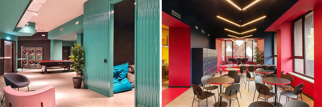重新的塑造后的CX Turin Regina的亮点是创建了一个新的学生和宾客社区,让他们能够以自由和灵活的方式来使用公共空间,一楼的自主餐厅、健身房和学习室,二楼设有公共厨房和供学生午休的露台,再往上的八楼就有一个可以俯瞰周边美景的屋顶露台,在这里可以欣赏河边的风景和都灵周边的群山环绕的壮丽景色。